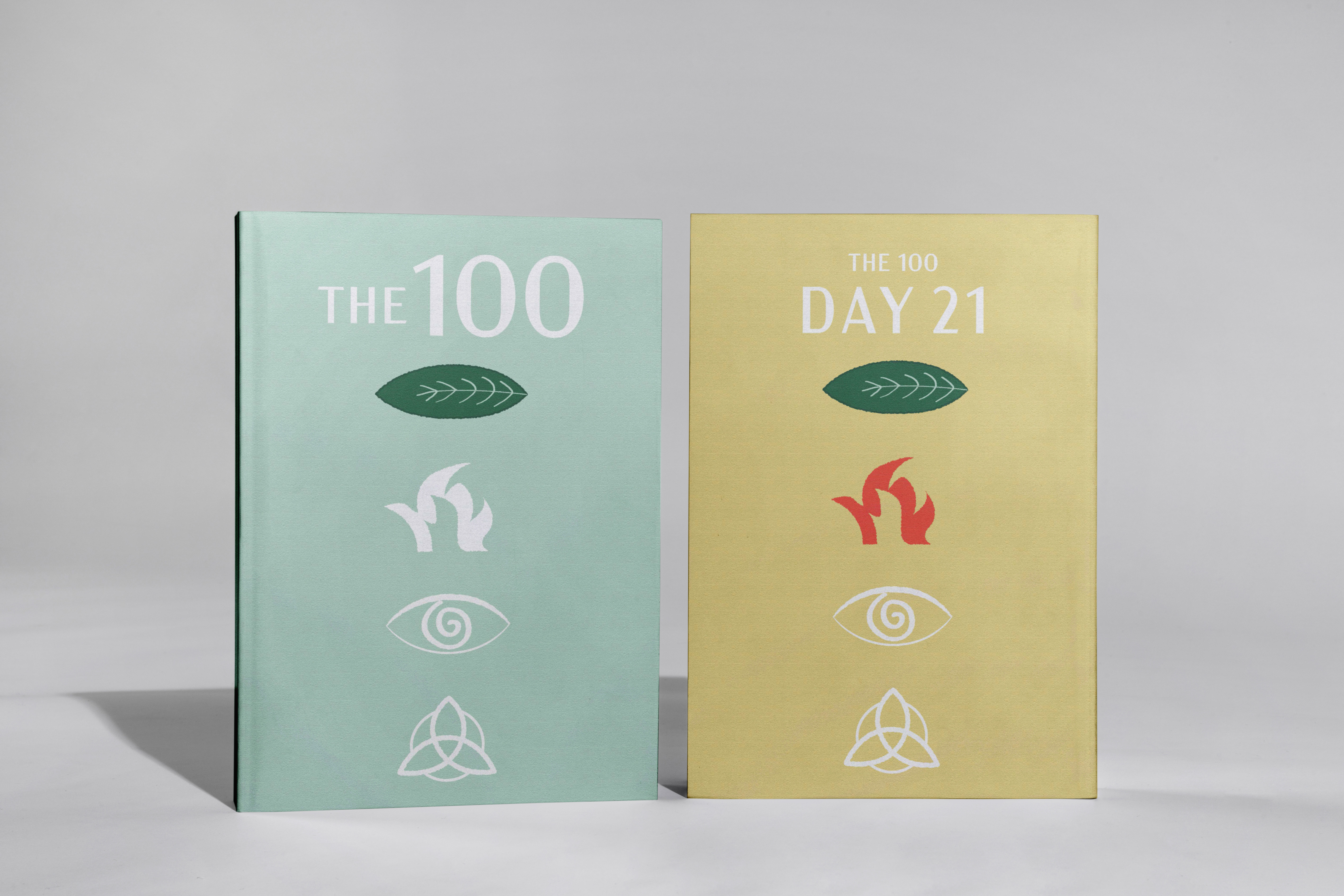 My goal with this redesign was to eliminate the show connection and reintroduce the book series as a whole, separate unit. The symbols on the cover of the 100 consecutively represent the themes in each of the books. Centered around the subject of people returning to live on earth after a nuclear apocalypse, the colors and icons communicate this topic to the reader.